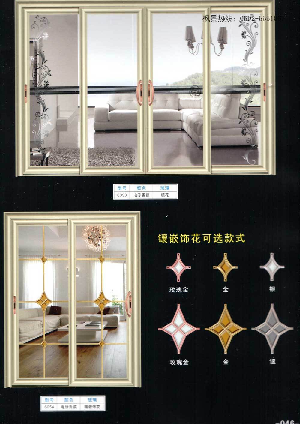 推拉门玻璃样式、格条样式04(6) 型号:6053,颜色:电泳香槟,玻璃:镜花。 型号:6054,颜色:电泳香槟,玻璃:镶嵌饰花。 上一页 1 2 3 4 5 6 7 8 9 下一页 上一篇 推拉门玻璃样式、格条样式03 上一篇 推拉门玻璃样式、格条样式05